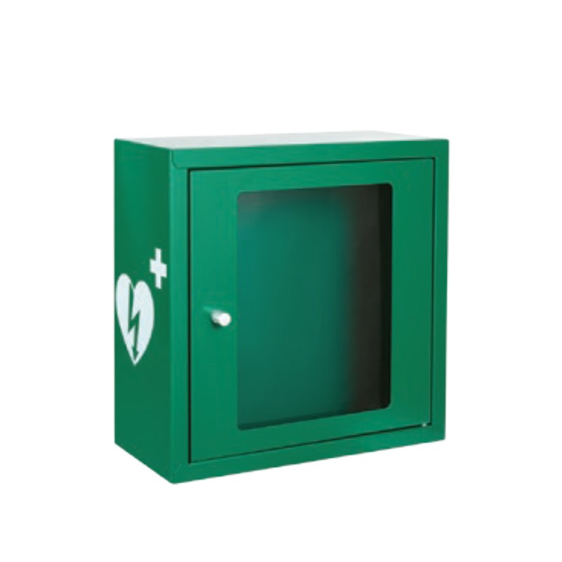 Vitrina armario desfibrilador ESTÁNDAR con cerradura por imán, en acero pintado blanco o verde con serigrafia de DESFIBRILADOR. Alarma de apertura de puerta desmontable. Dimensiones de 37 x 37 x 17 cm. Equipo básico estándar. Ventana de poliestireno rompible.,Logotipo conforme a normativa ILCOR, resistente y sólida